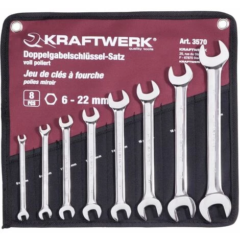 Kraftwerk Clé amphidromes 6-22 mm Set 8 -pcs Centrale électrique 3570R clé à double fourche coudée ensemble de 8 pièces dans le sac de rouleau 6 à 22 mm des deux côtés de 15 ° à partir d’acier au chrome-vanadium, chromé et poli à la norme DIN 3110 / ISO 1085, 3318, 10102