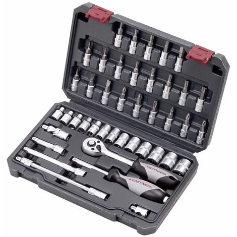 Kraftwerk Jeu de douilles, 1/4 », 42 pcs Centrale électrique 204101000 douille 1/4 pouce ensemble avec 1/4 pouce écrous enfichables de 4 mm 42 pièces à 14, l’ adaptateur, l’ extension, 1/4 douilles de bits pour vis à fente, Phillips, Allen et Torx® par un cliquet réversible des dents 45- et un des outils Tous Stecriff sont clairement disposés et à portée de main logée dans un boîtier robuste avec deux fermetures